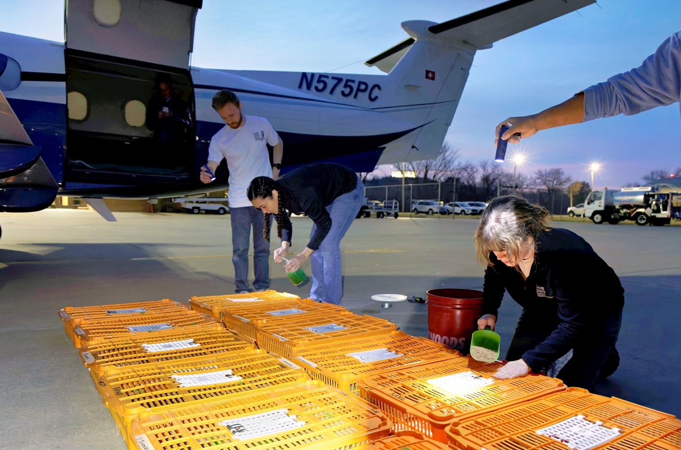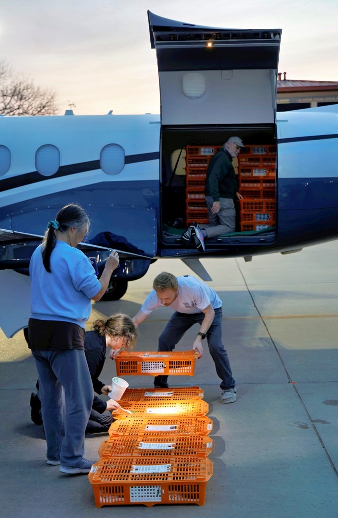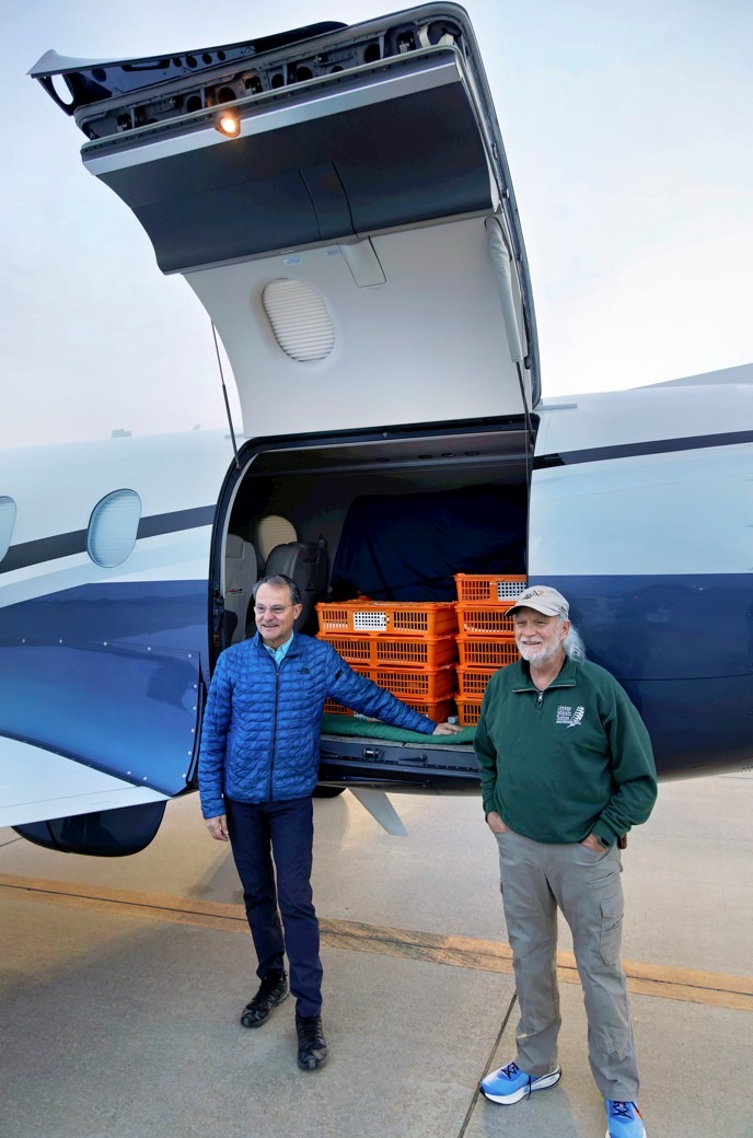After carefully logging and loading the crates, the Sutton Center team ensured the quail had food for the journey. The precious cargo was secured in Jack’s Pilatus PC-12 after two rear seats were removed to create the needed space. With everything strapped down, it was time to depart.